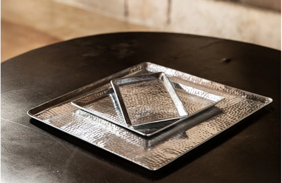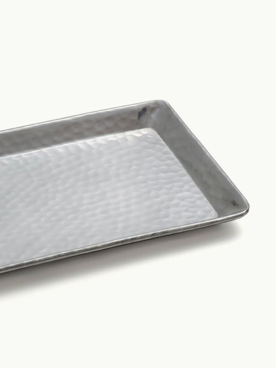 Ce plateau argenté au martelage rond et irrégulier est un intemporel de la salle de bain, mais saura aussi se rendre chic et indispensable en toute occasion festive. Plateau allongé, parfait pour y disposer un cake, des sushis, service à thé ou café, ou toute composition décorative de votre invention !