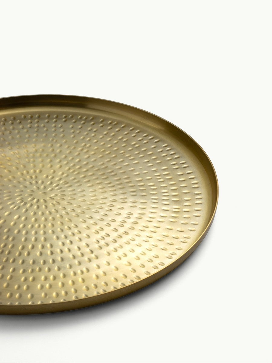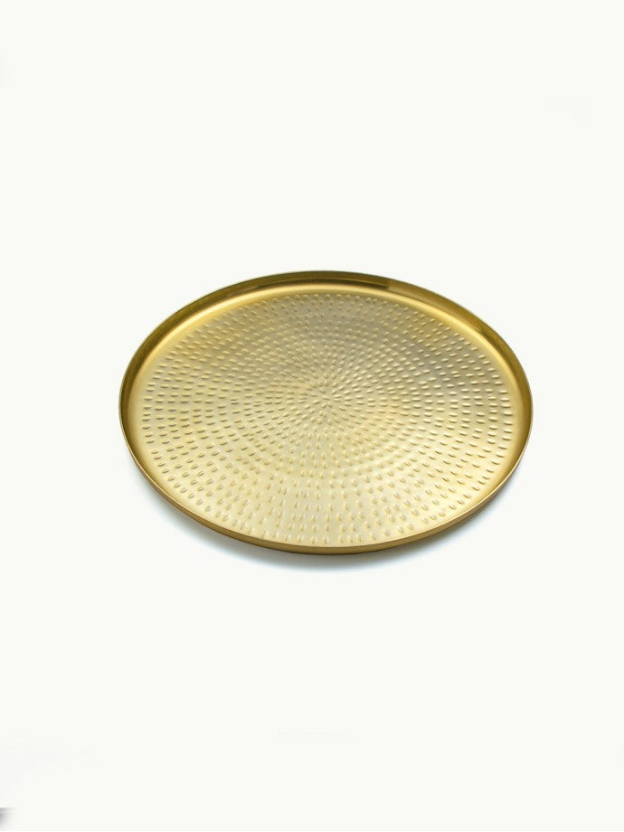 Plateau rond en laiton doré plaqué et martelé à la main, Existe en 2 tailles. diamètre 35 ou 45 cm.
