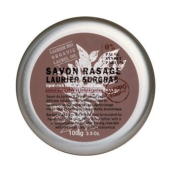Savon de rasage laurier surgras, hypoallergénique. Dans sa boîte en aluminium. 100g