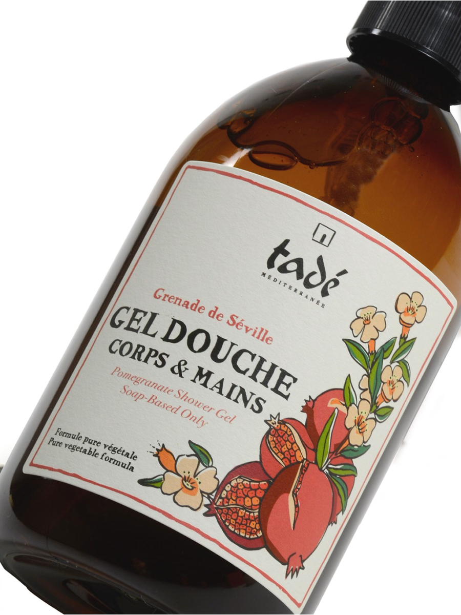Gel douche de soin artisanal et surgras, parfumé au gourmand et pétillant parfum de Grenade de Séville. Pour les peaux fragiles et délicates.